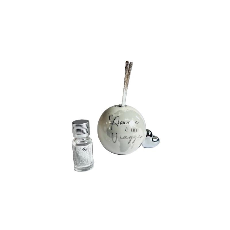 Diffusore modno piccolo con con applicazione cuore silver e scritta "L'amore è un viaggio". Kit midollini e profumo inclusi. Dimensioni 9.5x9x6 cm. Linea Bomboniere Claraluna.Comprensiva di scatola. Per quantità superiori ad 1 pezzo contattare il punto vendita via mail all'indirizzo laculladelleidee@gmail.com o telefonicamente al n.+39 345 9452117
