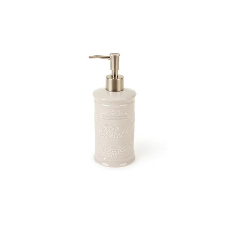 Dosasapone "Bath" bianco in ceramica con dosatore e scritta in rilievo.