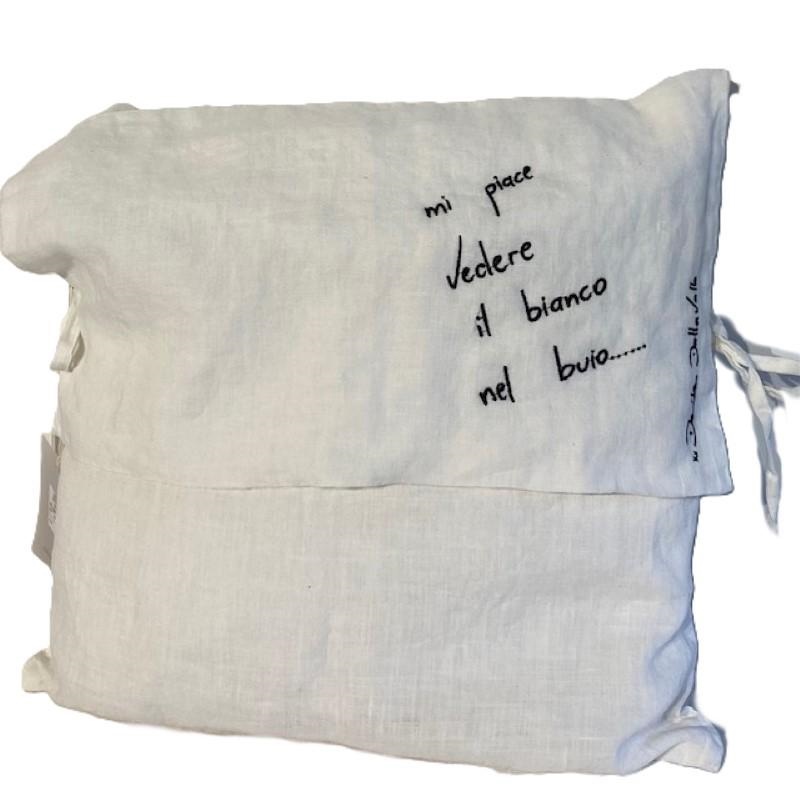 Federa in lino color retrò con laccetti per la chiusura, frase ricamata in nero per contrasto.
