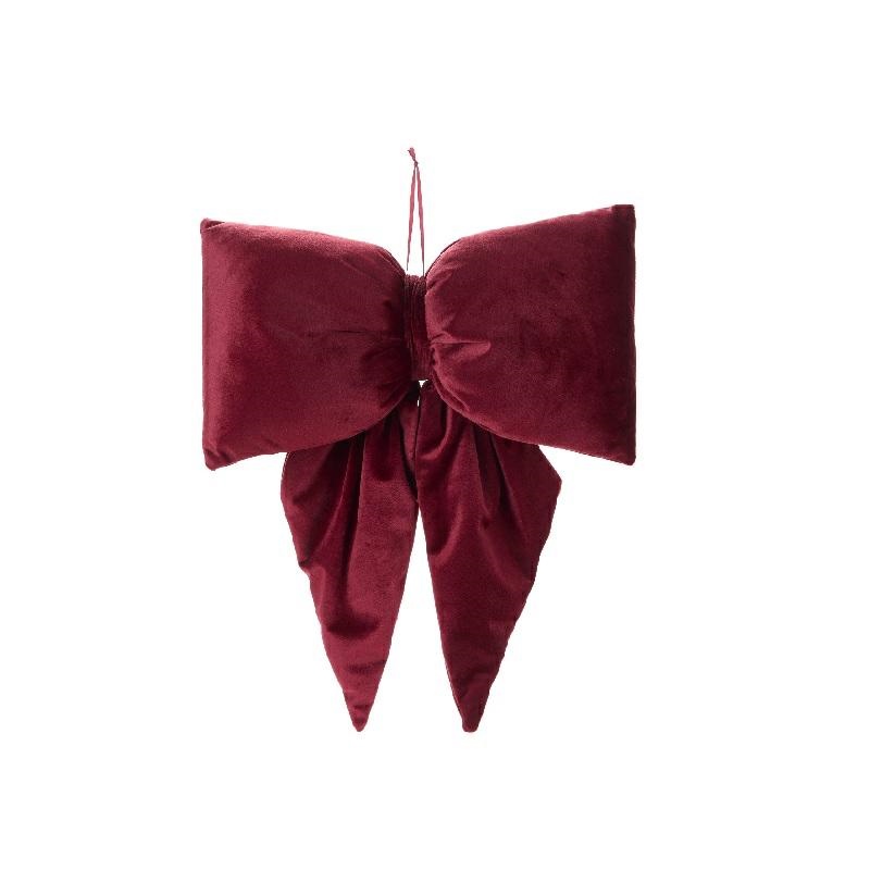 Fiocco imbottito in velluto bordeaux, dotato di un piccolo nastrino in raso per poterlo appendere.