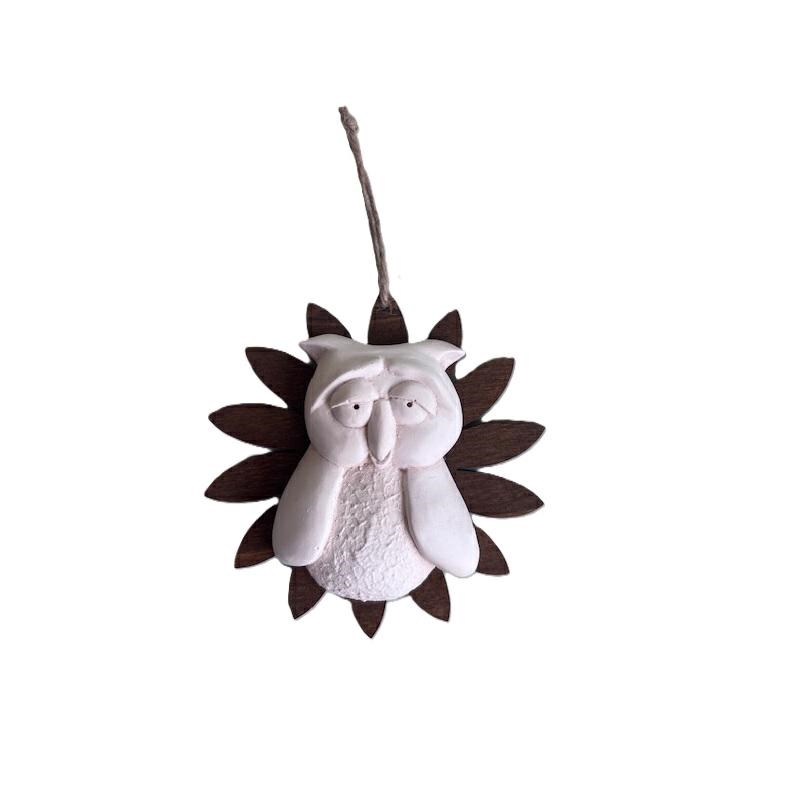 Fiore in legno con cordino per sospensione e decoro gufo di gesso.