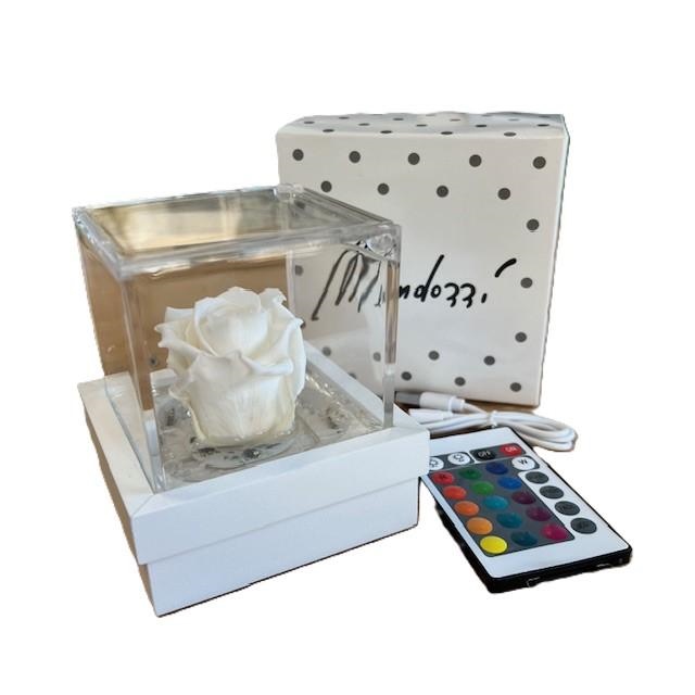 Lampada led. Scatolina plexi 8x8 con rosa stabilizzata bianca.