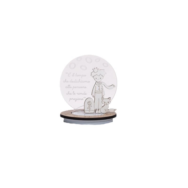 Lampada led Piccolo Principe, in plexi poggiata su una base di legno. Frase."E' il tempo che dedichi alle persone che le rende preziose". Dimensioni 7x7cm. Linea Bomboniere solidali Amici di Cuorematto. Scegliendo questa linea contribuisci a sostenere Antoniano che realizza interventi educativi e riabilitativi per bambini affetti da sindrome di down, autismo e patologie di ritardo mentale. Con l'acquisto minimo di 40 pz ricevi in omaggio le partecipazioni e avrai la disponibilità di un sito internet esclusivo per le tue nozze. Per maggiori informazioni, per quantità superiori ad 1 pezzo e per confezionamento bomboniere contattare il punto vendita via mail all'indirizzo laculladelleidee@gmail.com o telefonicamente al n.+39 345 9452117