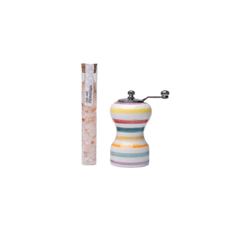 Macina sale a righe colorate dipinte a mano coon fialette di sale dell'Himalaya, rosato ideale per la carne, pesce e salse. Dimensioni 6x12cm. Scatola regalo inclusa. Linea Bomboniere solidali Cuorematto. Scegliendo questa linea contribuisci a sostenere Antoniano che realizza interventi educativi e riabilitativi per bambini affetti da sindrome di down, autismo e patologie di ritardo mentale. Con l'acquisto minimo di 40 pz ricevi in omaggio le partecipazioni e avrai la disponibilità di un sito internet esclusivo per le tue nozze. Per maggiori informazioni, per quantità superiori ad 1 pz o confezionamenteo bomboniere contattare il punto vendita via mail all'indirizzo laculladelleidee@gmail.com o telefonicamente al n.+39 345 9452117