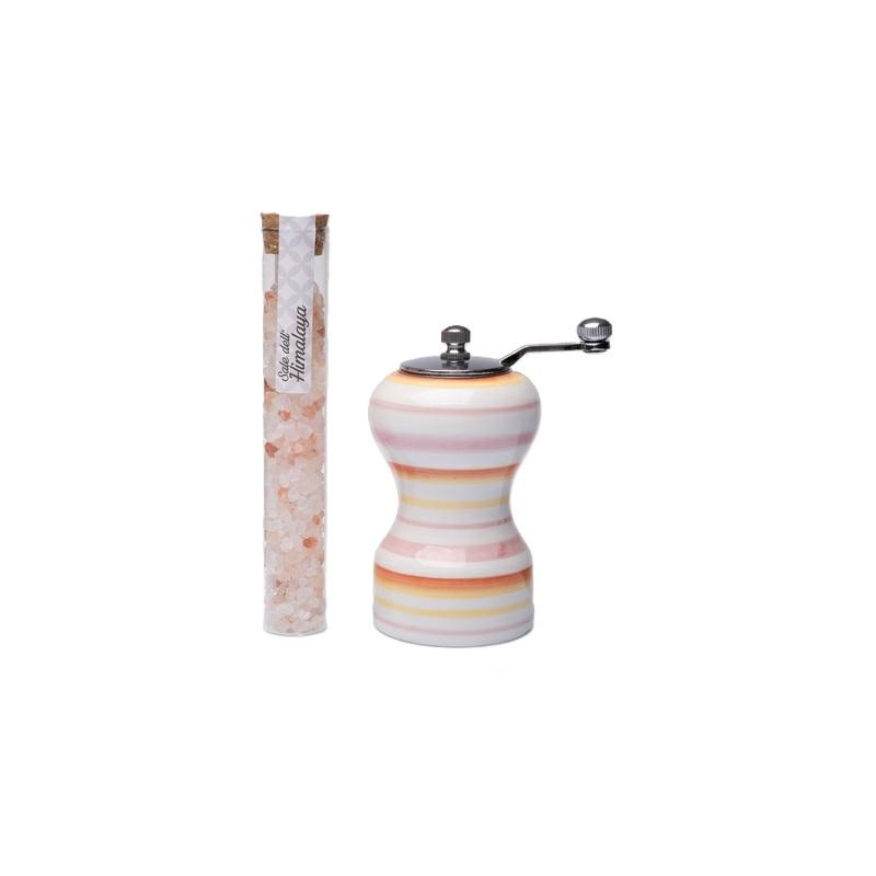 Macina sale a righe colorate dipinte a mano con fialette di sale dell'Himalaya, rosato ideale per la carne, pesce e salse. Dimensioni 6x12cm. Scatola regalo inclusa. Linea Bomboniere solidali Cuorematto. Scegliendo questa linea contribuisci a sostenere Antoniano che realizza interventi educativi e riabilitativi per bambini affetti da sindrome di down, autismo e patologie di ritardo mentale. Con l'acquisto minimo di 40 pz ricevi in omaggio le partecipazioni e avrai la disponibilità di un sito internet esclusivo per le tue nozze. Per maggiori informazioni, per quantità superiori ad 1 pz o confezionamenteo bomboniere contattare il punto vendita via mail all'indirizzo laculladelleidee@gmail.com o telefonicamente al n.+39 345 9452117