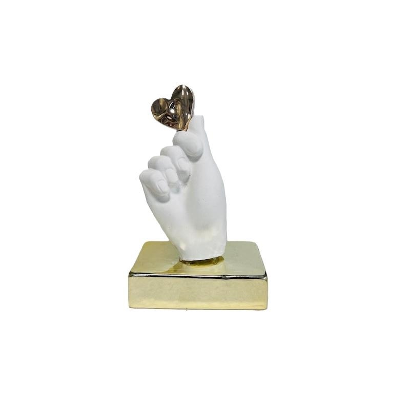 Mano in gesso su base oro con applicazione cuore oro sulle dita. Dimensioni 7.6x13x5.2 cm. Linea Bomboniere Claraluna.Comprensiva di scatola. Per quantità superiori ad 1 pezzo contattare il punto vendita via mail all'indirizzo laculladelleidee@gmail.com o telefonicamente al n.+39 345 9452117