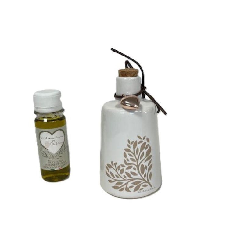 Oliera in ceramica con decoro cuore , ciondolo cuore color oro rosa, tappo in sughero e olio biologico incluso. Dimensioni 13 cm. Disponibile nella versione senza olio cod. 25074 €14.40 Linea Bomboniere Claraluna.Comprensiva di scatola. Per quantità superiori ad 1 pezzo contattare il punto vendita via mail all'indirizzo laculladelleidee@gmail.com o telefonicamente al n.+39 345 9452117