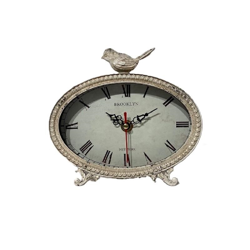 Orologio in metallo da tavolo con forma ovale e decorazione con uccellino.