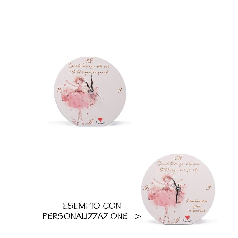 Orologio con fantasia ballerina con possibilità di personalizzazione. Dimensioni d.15 cm. Pila non inclusa. Linea Bomboniere solidali Cuorematto. Scegliendo questa linea contribuisci a sostenere Antoniano che realizza interventi educativi e riabilitativi per bambini affetti da sindrome di down, autismo e patologie di ritardo mentale. Per maggiori informazioni, per quantità superiori ad 1 pz e per la personalizzazione contattare il punto vendita via mail all'indirizzo laculladelleidee@gmail.com o telefonicamente al n.+39 345 9452117