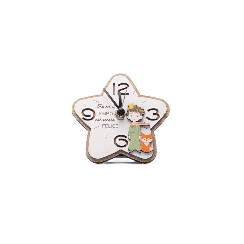 Orologio in legno a forma di stella con decoro Principe. Dimensioni d.11 cm. Pila non inclusa. Scatola inclusa. Linea Bomboniere solidali Cuorematto. Per maggiori informazioni, per quantità superiori ad 1 pz contattare il punto vendita via mail all'indirizzo laculladelleidee@gmail.com o telefonicamente al n.+39 345 9452117