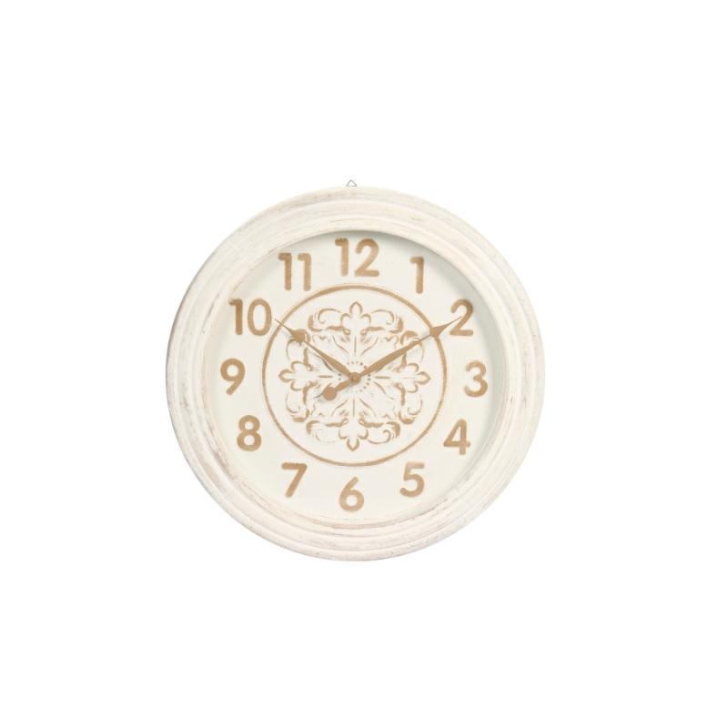 Orologio tondo in legno bianco effetto anticato con numeri dorati.