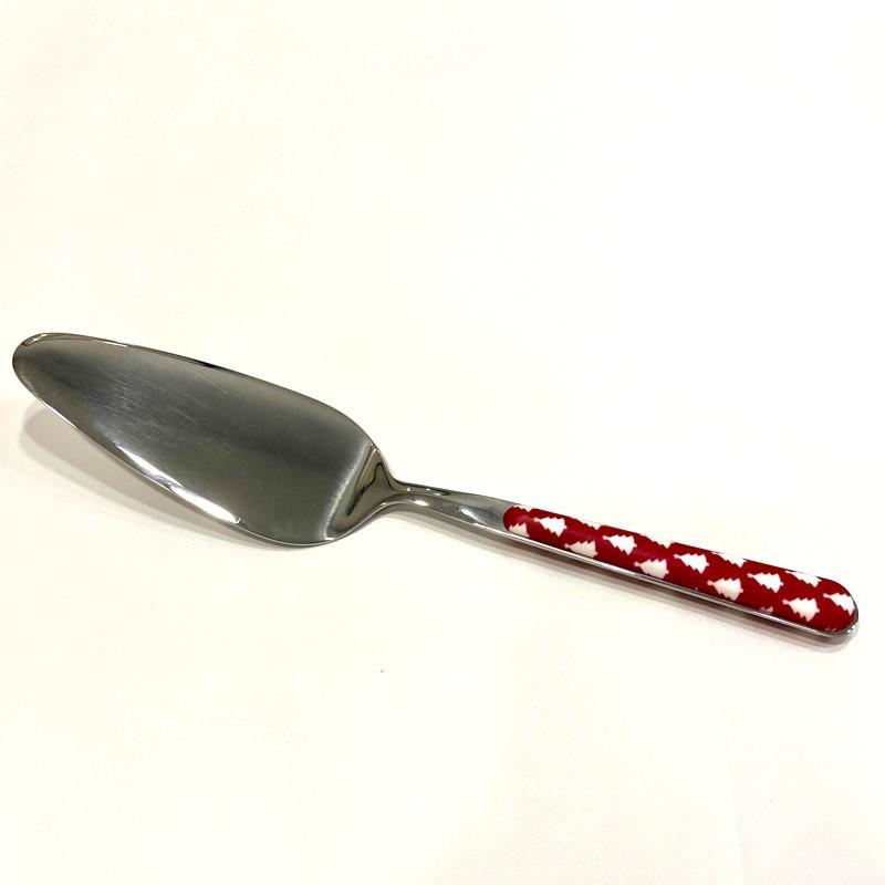 Pala per torta in acciaio inox lucido con manico in propilene colore rosso con fantasia alberi bianchi.