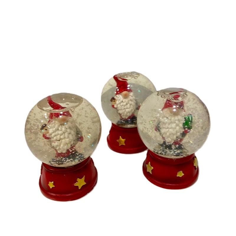 Assortimento di gnometti all'interno di una palla di vetro con acqua e neve.