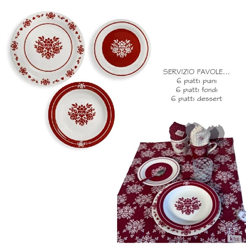 Servizio 18 piatti in ceramica lucida decorati completo di 6 piatti fondi da 23,4 cm, 6 piatti piani da 26 cm, 6 piatti dessert da 20,5 cm. La decorazione è della linea come nelle Favole per lasciarti trasportare sempre e soprattutto durante le feste.. Completa la collezione con gli altri articoli della linea.