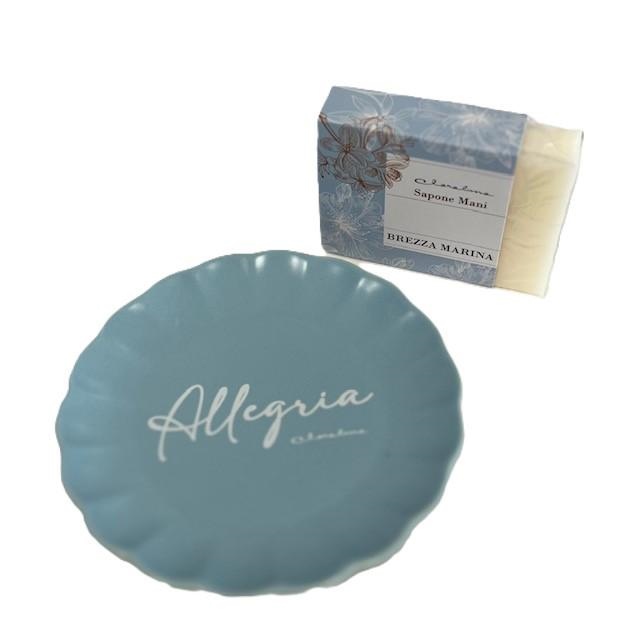 Piattino in ceramica con scritta Allegria, abbinato alla saponetta profumata Brezza Marina. Fantasia unica come in foto. Dimensioni 11.5x11.5x1.5 cm. Linea Bomboniere Claraluna.Comprensiva di scatola. Disponibile nella versione: solo piattino cod.25272P € 9.90 solo sapone cod. 25272S € 2.90 Per quantità superiori ad 1 pezzo contattare il punto vendita via mail all'indirizzo laculladelleidee@gmail.com o telefonicamente al n.+39 345 9452117