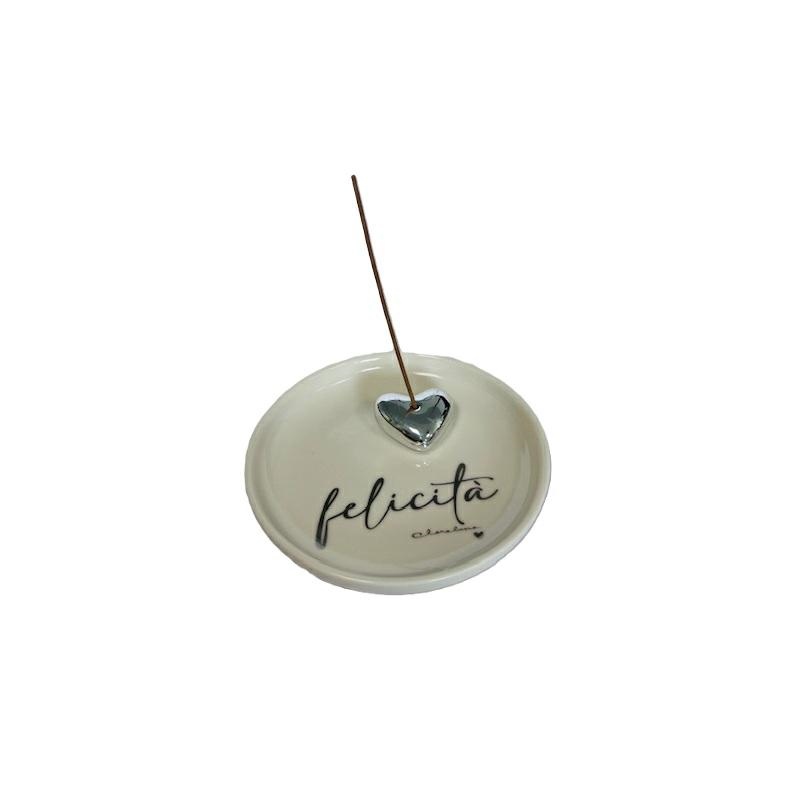 Piattino porta incenso con decoro scritta Felicità e cuore silver. Dimensioni 11.2x1 cm. Linea Bomboniere Claraluna.Comprensiva di scatola. Per quantità superiori ad 1 pezzo contattare il punto vendita via mail all'indirizzo laculladelleidee@gmail.com o telefonicamente al n.+39 345 9452117