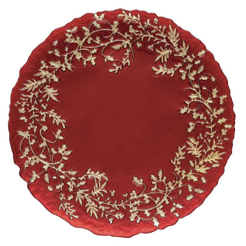 Piatto in vetro rosso con decorazione oro nel contorno piatto.