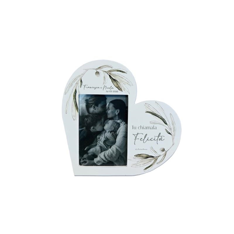 Porta foto in legno a forma di cuore della linea Ulivo. Con possibilità di personalizzazione. Dimensioni 14x13x1 cm Linea Bomboniere Claraluna.Comprensiva di scatola. Per quantità superiori ad 1 pezzo ed eventuale personalizzazione contattare il punto vendita via mail all'indirizzo laculladelleidee@gmail.com o telefonicamente al n.+39 345 9452117