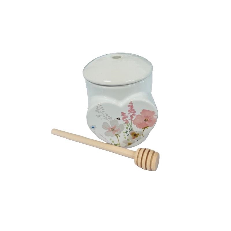 Porta miele in ceramica con coperchio e spargimiele, decoro floreale rosa. Dimensioni 6.5x7.5x9 cm. Linea Bomboniere Claraluna.Comprensiva di scatola. Per quantità superiori ad 1 pezzo contattare il punto vendita via mail all'indirizzo laculladelleidee@gmail.com o telefonicamente al n.+39 345 9452117