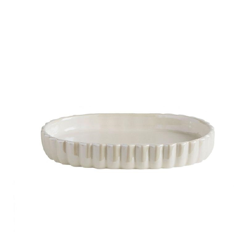 Porta sapone in ceramica con linee scanalate dalla finitura bianca iridescente. Ideale per valorizzare il vostro bagno.
