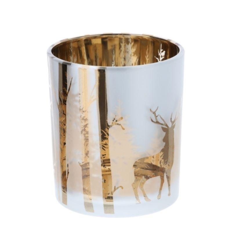 Portacandela in vetro colorazione rame/bronzo con decoro cervo.