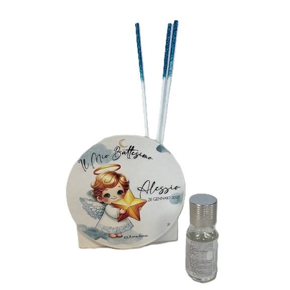 Profumatore in gesso con decorazione angioletto bimbo, personalizzabile, comprensivo di midollini e profumo. Dimensioni d.10 cm. Linea Bomboniere Claraluna.Comprensiva di scatola. Per quantità superiori ad 1 pezzo e personalizzazione contattare il punto vendita via mail all'indirizzo laculladelleidee@gmail.com o telefonicamente al n.+39 345 9452117