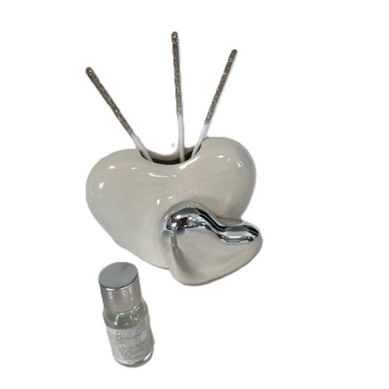 Profumatore grande doppio cuore bianco e silver con midollini e profumo. Dimensioni circa 14x17x6 cm. Linea Bomboniere Claraluna.Comprensiva di scatola. Per quantità superiori ad 1 pezzo contattare il punto vendita via mail all'indirizzo laculladelleidee@gmail.com o telefonicamente al n.+39 345 9452117