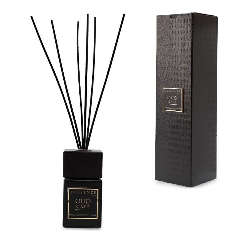 Profumatore per ambiente con midollini della nuova linea Oud Line di Dessenze in bottiglietta nera opaca. Dimensioni 100ml. Fragranza Cafè : fragranza aromatica,dolce e avvolgente. NOTE DI TESTA: Mandorla e Note Aromatiche NOTE DI CUORE: Caffè Tostato NOTE DI FONDO: Caramello e Zucchero