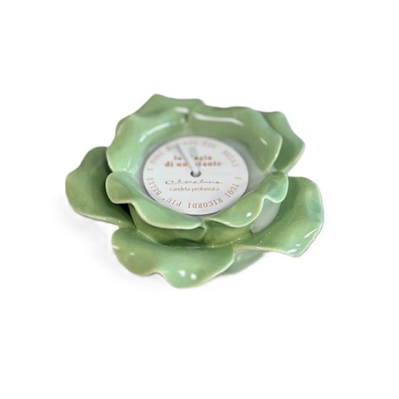 Rosa in porcellana verde con candela profumata. Dimensioni d. 9x6cm. Linea Bomboniere Claraluna.Comprensiva di scatola. Per quantità superiori ad 1 pezzo contattare il punto vendita via mail all'indirizzo laculladelleidee@gmail.com o telefonicamente al n.+39 345 9452117