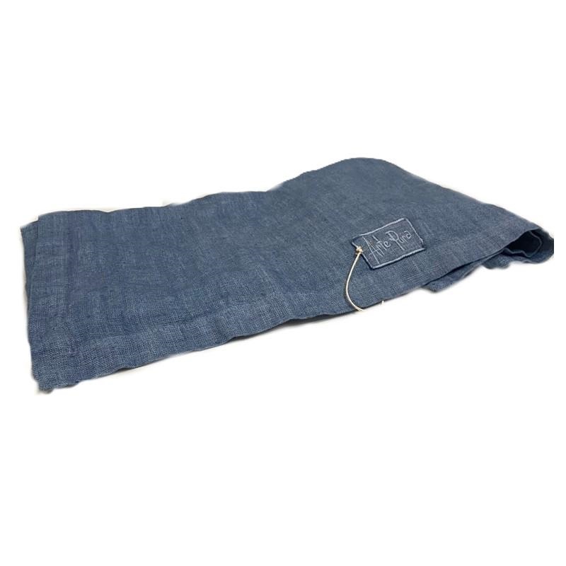 Runner in lino pesante, bordo con piega e inserto rettangolare logo Arte Pura.