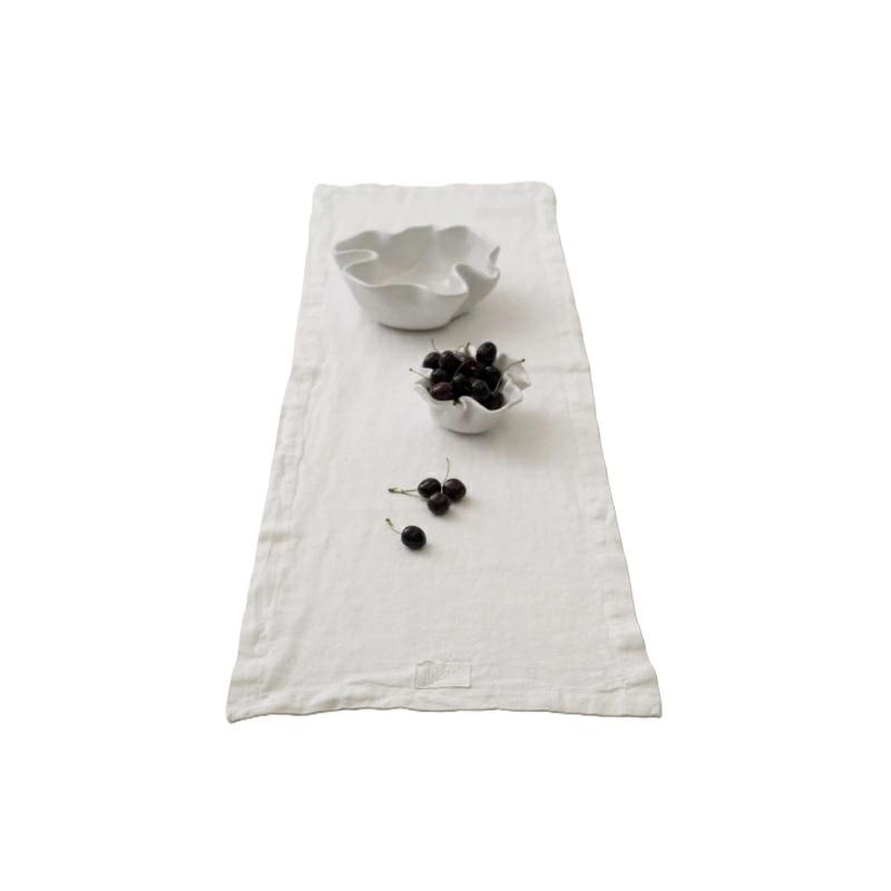 Runner in lino pesante, bordo con piega e inserto logo Arte Pura.