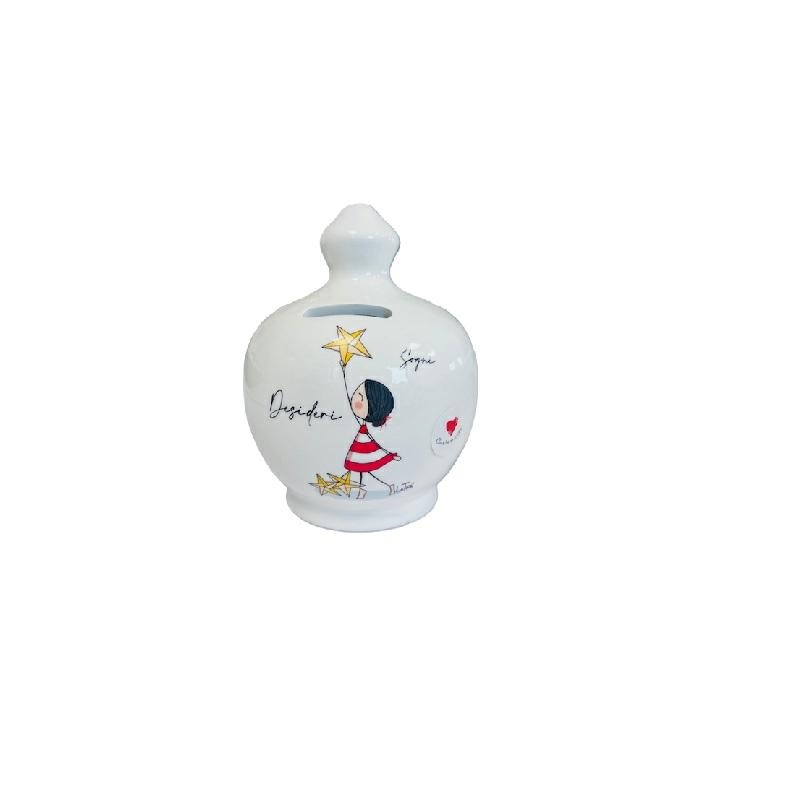 Salva sogni in ceramica con decorazione serie La Tipa, tappo in plastica per apertura. Dimensioni d7xh9cm. Scatola regalo inclusa. Linea Bomboniere solidali Cuorematto. Scegliendo questa linea contribuisci a sostenere Antoniano che realizza interventi educativi e riabilitativi per bambini affetti da sindrome di down, autismo e patologie di ritardo mentale. Con l'acquisto minimo di 40 pz ricevi in omaggio le partecipazioni e avrai la disponibilità di un sito internet esclusivo per le tue nozze. Per maggiori informazioni, per quantità superiori ad 1 pezzo contattare il punto vendita via mail all'indirizzo laculladelleidee@gmail.com o telefonicamente al n.+39 345 9452117