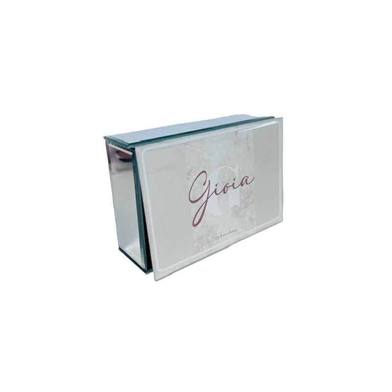 Scatola portagioie in vetro con colorazione neutra e scritta "Gioia",l'interno è in velluto nero. Dimensioni 15x10x5,2 cm. Linea Bomboniere Claraluna.Comprensiva di scatola. Per quantità superioriad 1 pezzo contattare il punto vendita via mail all'indirizzo laculladelleidee@gmail.com o telefonicamente al n.+39 345 9452117