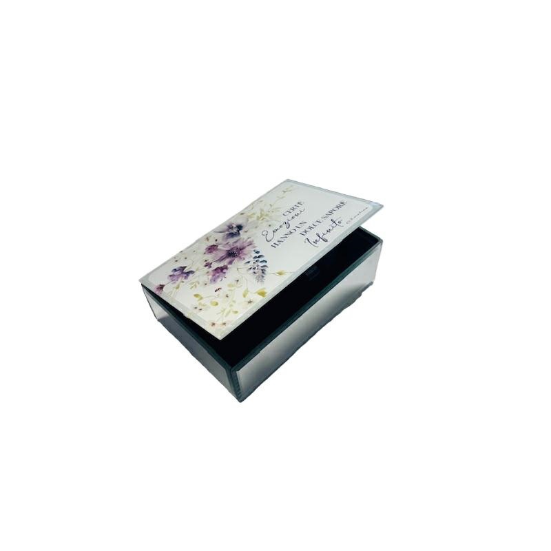 Scatola portagioie in vetro con decorazione floreale lilla e scritta "Certe emozioni hanno un dolce sapore infinito",l'interno è in velluto nero. Dimensioni 15x10x5,2 cm. Linea Bomboniere Claraluna.Comprensiva di scatola. Per quantità superiori ad 1 pezzo contattare il punto vendita via mail all'indirizzo laculladelleidee@gmail.com o telefonicamente al n.+39 345 9452117