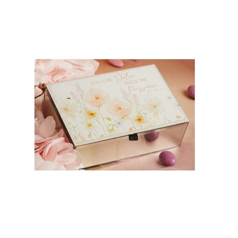 Scatola portagioie in vetro con decorazione floreale rosa e scritta "Sei la più dolce delle mie passioni",l'interno è in velluto nero. Dimensioni 15x10x5,2 cm. Linea Bomboniere Claraluna.Comprensiva di scatola. Per quantità superiori ad 1 pezzo contattare il punto vendita via mail all'indirizzo laculladelleidee@gmail.com o telefonicamente al n.+39 345 9452117