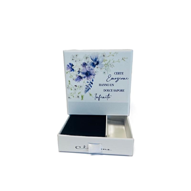 Scatolina per confetti bianca con decorazione floreale lilla, scritta "Certe emozioni hanno un dolce sapore infinito", con possibilità di personalizzazione. Dimensioni 10x10x3 cm.Confetti non inclusi. Linea Bomboniere Claraluna. Per quantità superiori ad 1 pezzo e per la personalizzazione contattare il punto vendita via mail all'indirizzo laculladelleidee@gmail.com o telefonicamente al n.+39 345 9452117