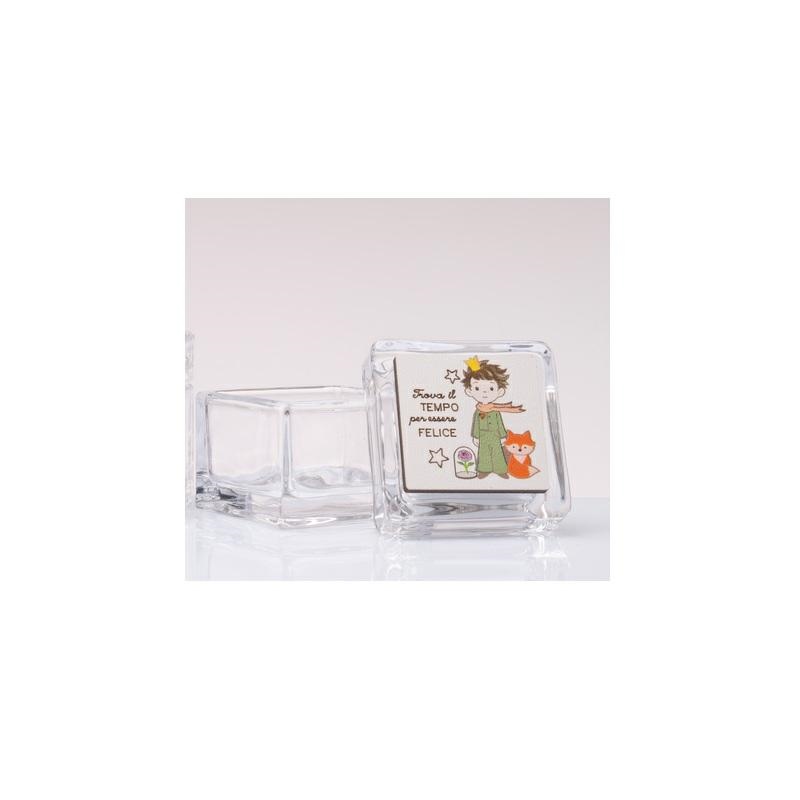 Scatolina in vetro Principe. Dimensioni 5x5 cm. Scatola non inclusa. Linea Bomboniere solidali Cuorematto. Per maggiori informazioni, per quantità superiori ad 1 pz contattare il punto vendita viamail all'indirizzo laculladelleidee@gmail.com o telefonicamente al n.+39 345 9452117