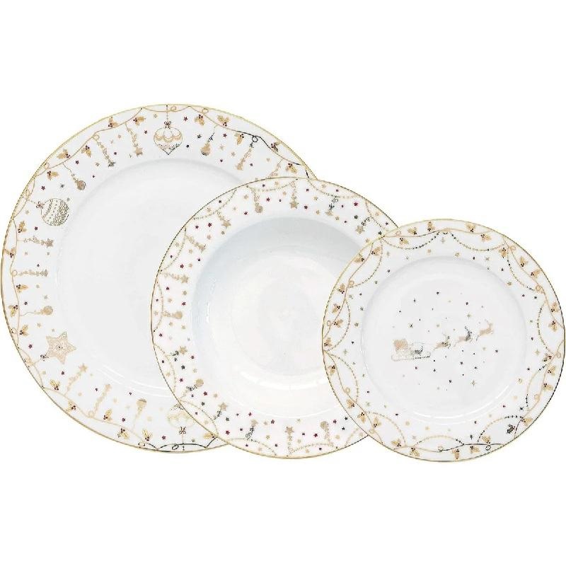 Servizio piatti da 18 pezzi composto da: 6 piatti piani d.26.5 cm, 6 piatti fondi d. 21.5 cm e 6 piatti dessert d. 19 cm in finissima porcellana bianca con decorazione natalizia della linea ChirstmasLights.