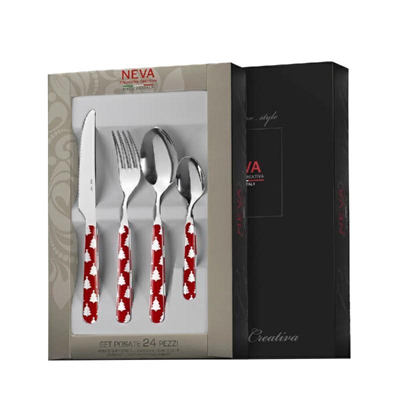 Set posate da 24 pezzi composto da 6 forchette, 6 cucchiai, 6 coltelli e 6 cucchiaini in acciaio inox lucido con manico in propilene colore rosso con decoro alberi bianco.