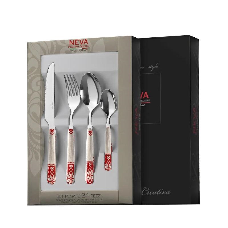 Set 24 posate composto da: 6 coltelli, 6 forchette, 6 cucchiai e 6 cucchiaini in acciaio inox con manico fantasia Christmas Chalet. Sfondo bianco/grigio e fantasia rossa.