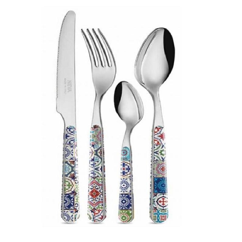 Set posate da 24 pezzi composto da 6 forchette, 6 cucchiai, 6 coltelli e 6 cucchiaini in acciaio inox lucido con manico in propilene fantasia maiolica.