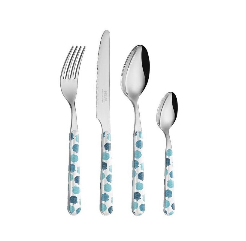 Set posate da 24 pezzi composto da 6 forchette, 6 cucchiai, 6 coltelli e 6 cucchiaini in acciaio inox lucido con manico in propilene colore sfondo bianco con decorazioni conchiglie blue e azzurre.