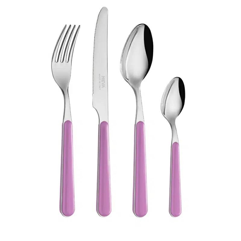 Set posate da 24 pezzi composto da 6 forchette, 6 cucchiai, 6 coltelli e 6 cucchiaini in acciaio inox lucido con manico in propilene colore lilla.