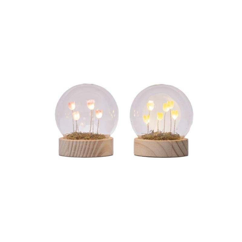 Set composto da due lampade notturne led in boccia con fiori gialli e rosa assortiti. Dimensioni 10x11cm. Pile non incluse. Acquistabile a set di 2 pezzi (una per colore). Per maggiori informazioni, per quantità superiori ad 1 set contattare il punto vendita via mail all'indirizzo laculladelleidee@gmail.com o telefonicamente al n.+39 345 9452117