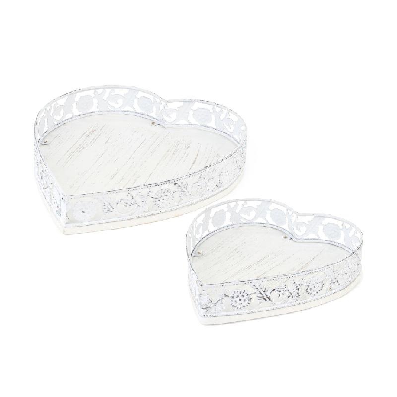 Set 2 vassoi a cuore in legno e metallo bianco