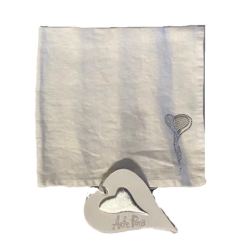 Set composto da 6 tovaglioli in lino con strass e cristalli bianchi che vanno a formare un cuore.