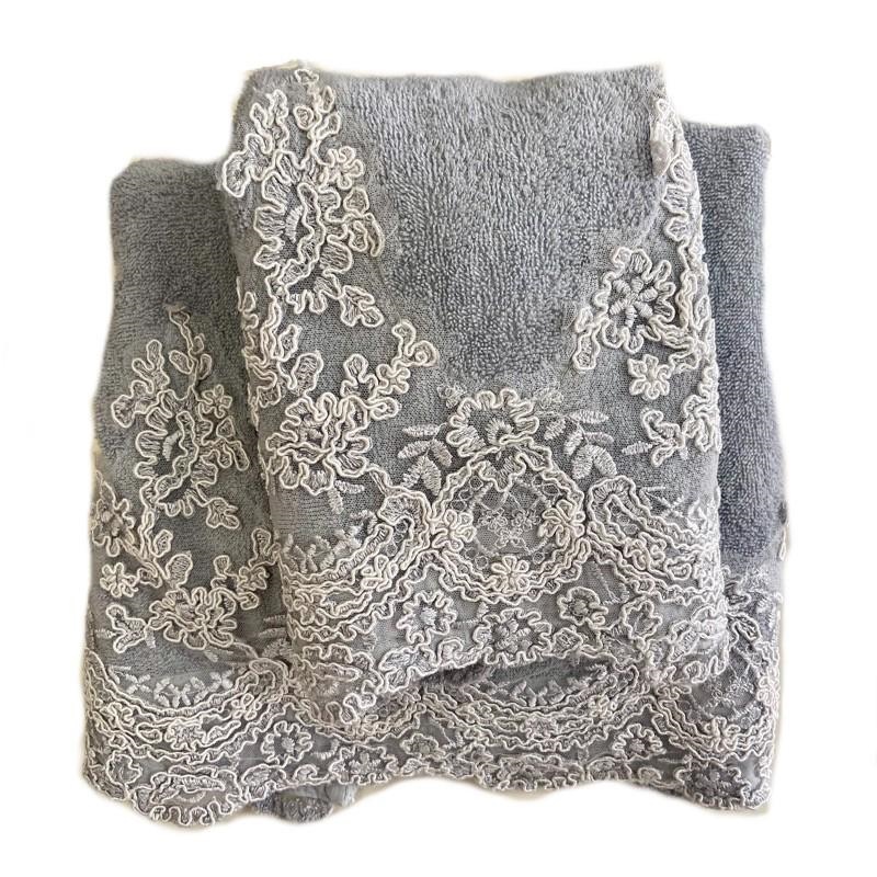 Set Asciugamani viso e ospite in spugna con pizzo elegante. Il set è composto da 1 asciugamano viso ed 1 asciugamano ospite in spugna con pizzo sinergia sul bordo. Colore Pensiero. Dimensione 60x100 cm e 40x60 cm. Tessuto: 100% Cotone con pizzo Elegante.
