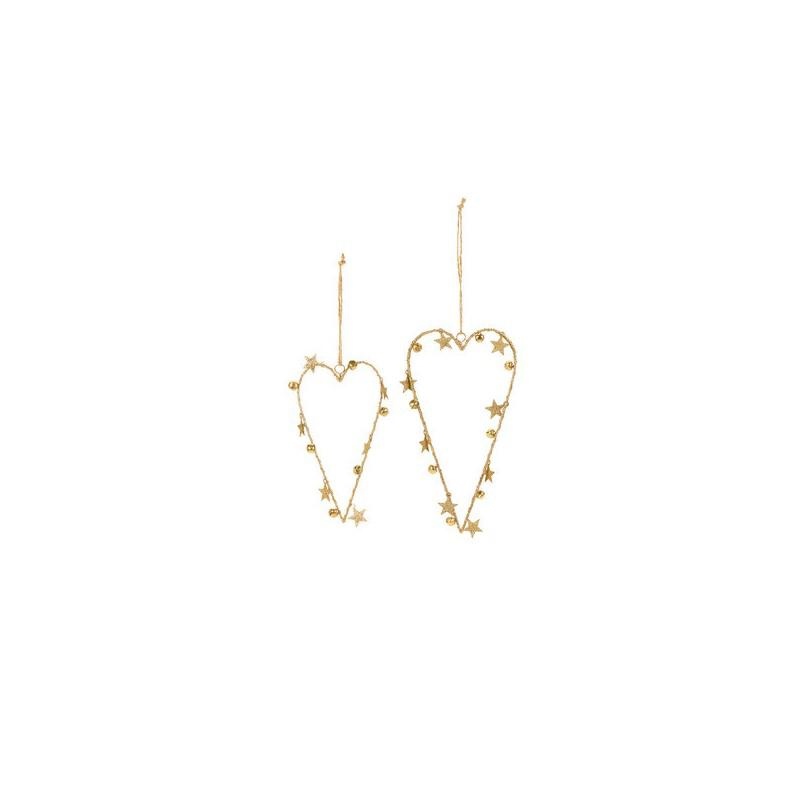 Set composto da due decorazioni in metallo a forma di cuore, dorato, con cordino per sospensione.