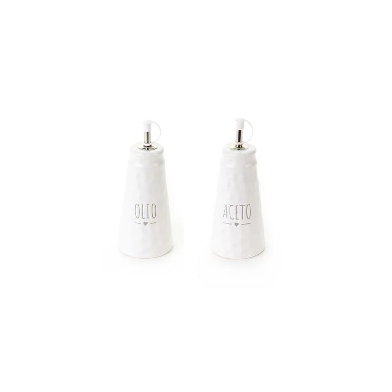 Set olio e aceto della linea My Home , compresi di beccuccio in metallo con tappino in plastica, sono in ceramica bianca con decorazione scritta.