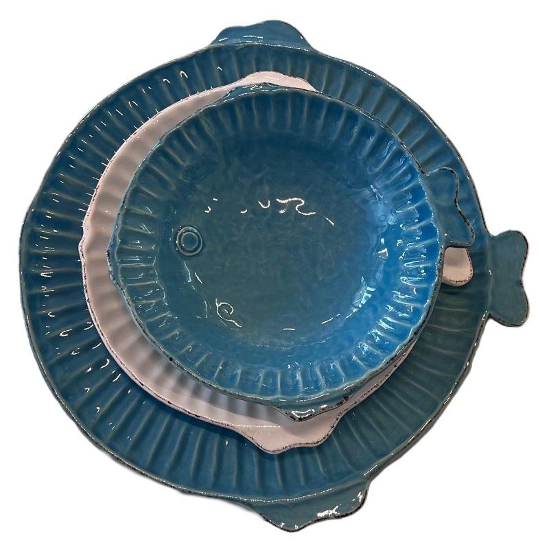 Set di 18 piatti della linea Pesce Pietra di Virginia Casa Il set in ceramica realizzato artigianalmente in Toscana comprende 6 Piatti Piani colore Turchese dimensione diametro 28 cm 6 Piatti Insalata colore Bianco dimensione diametro 21 cm 6 Bolo Zuppa colore Turchese dimensione diametro 17 cm Lavabili in lavastoviglie e adatti al microonde .